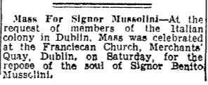 And yet the “embarrassments” continued right up until the end of the war, with both the Irish Independent and Irish Press of 7 May 1945 publishing the following short article: “Dublin Mass for Mussolini—At the request of members of the Italian colony in Dublin, Mass was celebrated at the Franciscan Church, Merchants Quay, on Saturday morning for the repose of the soul of Benito Mussolini”.